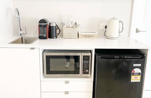 * Small kitchenette (sink, microwave, bar fridge, tea/coffee)