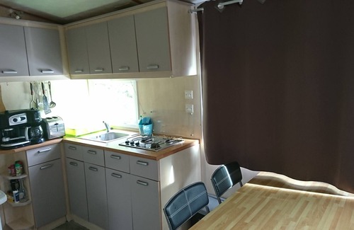 The Mobile home has 2 bedrooms, the first with a double bed (140/190), and the second two single beds (75/190). Lounge with corner seat, TV, hi-fi. The kitchen with a multifunction oven (microwave, grill, oven), fridge-freezer, coffee maker, dishes and small practical utensils. Dining Area. Bathroom and separate toilet. Terrace with table, 4 chairs, offset parasol.