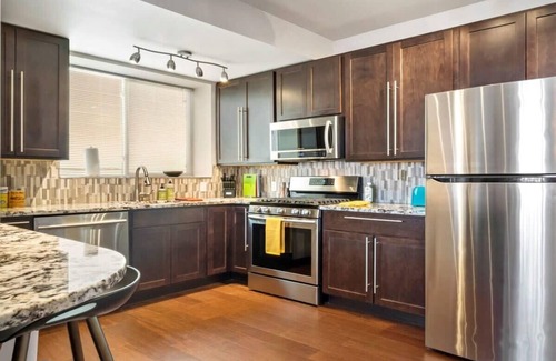 Our designer apartment is set up with all of the luxuries, comforts, and amenities you can imagine. An open floor plan fuses the spacious living room and kitchen to create a warm and inviting space where you can spend quality time with loved ones whether you’re cooking or lounging.