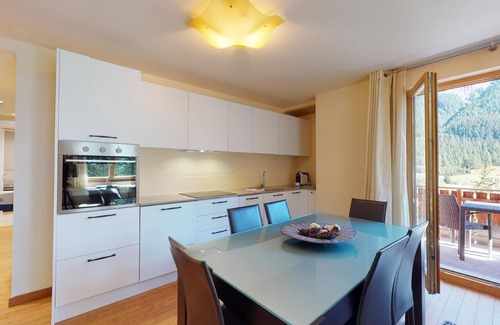 Modern 3½ room flat on the 1st floor, approx. 67m² in size. Entrance with wardrobe. Open living and dining room with kitchenette. Dining table with six chairs, one sofa, Smart-TV and balcony. Kitchen with cooker, oven, refrigerator and dishwasher. One double room with Smart-TV. One room with a single bed and a loft bed. Bathroom with tub, sink, toilet and bidet. WLAN. Shared ski and bike room and washing machine in the basement. One parking space in the underground car park (height max. 210 cm).