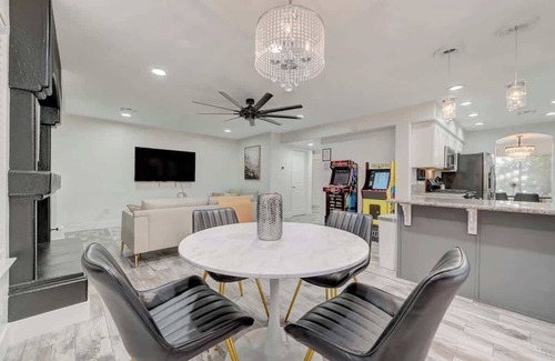 Escape to a dreamy oasis in this 4-bedroom Airbnb retreat that accommodates up to 10 guests. Immerse yourself in luxury with a private pool, perfect for lazy afternoons. Unwind in the game room with a pool table and arcade games, or gather in the spacious kitchen for culinary adventures. Indulge in the charm of cozy bedrooms and relish the tranquility of a lush backyard. Your ideal getaway awaits, offering a perfect blend of relaxation and entertainment.