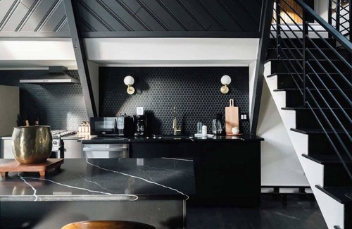 In the loft upstairs, you’ll find the primary bedroom, featuring a pillowy queen bed, sitting area, workspace, and en suite bathroom with a gorgeous walk-in glass shower and tons of natural light. On the main floor, you’ll find a second and third bedroom, which offer ample space for a family or group of friends. The second bedroom has bunk beds, and the third bedroom sleeps 2 with a twin bed and trundle.