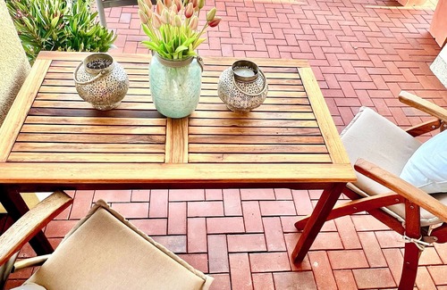 The 70sqm apartment is on the ground floor and has a living room with dining area, bedroom with a box spring bed (1.80 x 2.00m), a bathroom with a floor-to-ceiling shower and a state-of-the-art built-in kitchen (dishwasher, Jura coffee machine, oven, ceramic hob). From the living room as well as from the kitchen you come directly to the terrace and can enjoy the beautiful view.