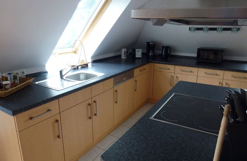 Modern granny flat on the first floor in a family house with its own entrance via an external staircase. High quality beds and equipment for up to 5 people, 6 people on request. South balcony with beautiful pond view and west balcony with beautiful evening sun. Spacious rooms with high-quality equipment such as B. Fireplace and sliding doors to the lake view. Flat screen TV with DVD player and WII game console. Complete kitchen equipment with kitchen island and many kitchen appliances. Large bathroom with dressing room and shower / bathtub. Washing machine is available. A somewhat steep staircase leads to the loft, where a double bed and 2 single beds are divided into 30 square meters. The 5th and possibly 6th Person sleeps on the pull-out sofa bed.