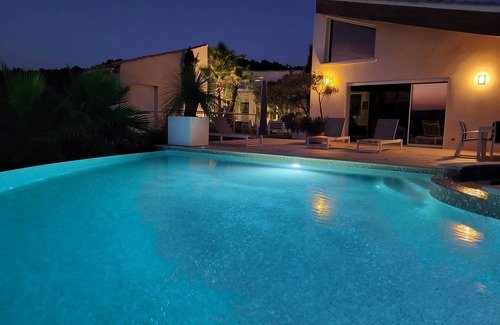 Magnificent and original recent contemporary architect-designed villa of 250 m2 in the shape of a spiral, winding around a superb patio of 80 m2 in wood and exotic vegetation, surrounded by a large terrace of 180 m2 lined with palm trees and leading to the superb infinity pool of 65 m2 (snail-shaped, with 10 linear meters of overflow), the 7-seater jacuzzi, and the dominant view over the valley. 4 bedrooms including 2 with private bathroom and 1 with private terrace, 1 independent bathroom, luxury services, all comfort (air conditioning, central aspiration, fireplace, LCD TV 136 cm, weight bench, large electric stainless steel plancha, neat decoration, large volumes in the kitchen and living room with exposed beams and mezzanine, many windows overlooking a large terrace, the patio, or the immense and magnificent landscaped garden of 4000 m2 without vis-à-vis, quiet and secure. The garden, the terraces, the patio and the pool are lit, giving a different atmosphere and very friendly from nightfall. Ideally located between the Mediterranean Sea (30 minutes) and the hinterland of the Hérault (20 minutes from the gorges of the Hérault), 15 minutes from the beautiful city of Montpellier, on the outskirts of a residential village of 2000 inhabitants surrounded by vineyards, olive groves and garrigue. Many activities on site: private multisport field (with petanque, ping-pong, archery, badminton, volleyball), hiking and mountain biking from the villa (bicycles not provided). Many activities in the surroundings: descent of the gorges of the Hérault by canoe, visit of the village of St Guilhem le Désert, Golf, tennis, karting circuit 10 minutes, bike rides or mountain biking, hiking, visit of the Camargue, Montpellier (place de la Comédie, museums,...), Sète, seafood tasting from the Thau lagoon, seaside resorts of Palavas, La Grand Motte, ...