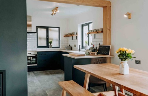 Located over the entire upper floor of the property, there is a well-equipped fully integrated kitchen with breakfast bar and a dining area with views over the beach. The living area with corner sofa, boasts a log burner for cosy Winter nights in. Open up the patio doors and enjoy the sea breeze from the balcony.