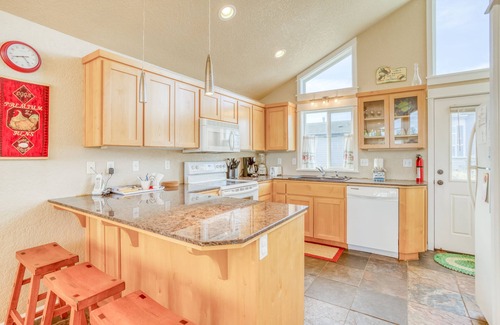 This cozy cabin sits just a block from Alsea Bay and is a short walk to a mile of sandy beach and you’ll also enjoy access to the seasonal pool at the Bayshore Beach Club, plus the neighborhood playground and tennis courts. This cabin will keep you cozy with its large couch and flat-screen TV and its beautiful bay view!