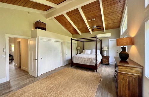 **PARADISE FOUND!!** If you are looking for a fun, private home with ultra plush comforts and well appointed modern beach decor for your North Shore vacation, this is your spot. The main house is 4 bedrooms and 2.5 bathrooms with an upper/lower set up and a cozy den/game/ tv area making this a perfect place for a family or small mellow group. There is a separate cottage with a king bed and wet bar with a half bath and outside shower for the 5th bedroom.