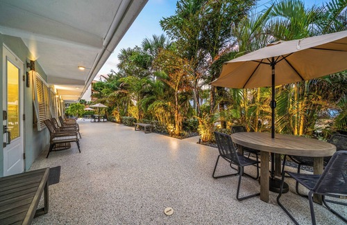 There is a lovely patio out front with tables and chairs. In the back there is a beautiful deck with dining tables and a chat area under a pergola surrounded by lush landscaping and enchanting lighting at night. We have multiple grills, complimentary assigned parking, an onsite complimentary laundry room, a bike rack and an outdoor shower.