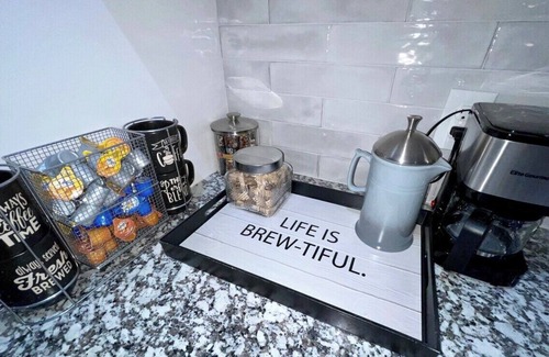 Relax and enjoy this stylishly boho space: a pristine 2 BR/2BA home with a 1 car garage, decorated in bold hues of teal, rust, black, and cream. The 2 bedrooms have incredibly comfortable pillow-top king & queen beds and black out curtains to enhance solitude while you're sleeping. The primary bedroom has a double-sink en suite bathroom.