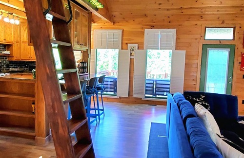The Jungalow sits on stilts overlooking the Ocoee River with a large deck where you can enjoy your morning coffee and the sunrise, watching the water go by. Later in the day, river stairs will take you right into the water where you can cool off or enjoy some fishing (bass, bluegill, sunfish) or walk over to the neighborhood boat ramp to scope out the tubing access. Gather around the firepit with cooking grill at night with your favorite beverage and watch the sunset behind the house! Sit and relax at the brand new outdoor covered bar and barbeque shed! The Jungalow has a large 1-acre yard and provides plenty of space for lawn games. We provide four sit-on-top kayaks (two single person kayaks, one double seater, one kid-sized) and a variety of tubes for guests to enjoy, as well as cornhole boards. There are two traditional bedrooms and two open-air (no doors for privacy) bedroom loft spaces. The Master has a king-sized bed, the second bedroom has two twin beds and the lofts each have a full-sized bed. The bathroom has a combination tub/shower as well as a washer and dryer for guest use. All beds have Dreamcloud hybrid mattresses. The couch is large enough for someone to sleep on if desired, though it is not a sleeper sofa.