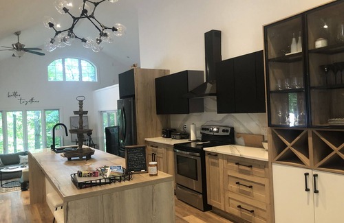 Incredible views of the valley on the wooded property. Outdoor fire pit. Beautiful private deck with hot tub. Spacious primary bedroom with gorgeous valley views. 2nd bedroom with 2 queen beds. 3rd bedroom with queen bed with barnboard accents and valley views. 4th sleeping area is in the bonus room/office. It has a fold out queen bed (not a pull out) so it's super comfortable and privacy with stunning walnut sliding doors. Laundry facilities are on site but please only do small loads as required since we are on a septic system with a well. We DO NOT have child proof guards on the electrical plugs or baby gates in place. There are two steps down into the main living room which opens up to a beautiful screened in porch with sliding doors for peace and quiet. There is a main bathroom with shower and large vanity, also a powder room with live edge vanity. The Coffee/Bar area has beautiful honed granite counter tops, microwave and an extra fridge. The den/office has a small desk for anyone doing remote work or can be the perfect hang out space for the kids with bean bag chairs, TV, and a comfy low profile couch.