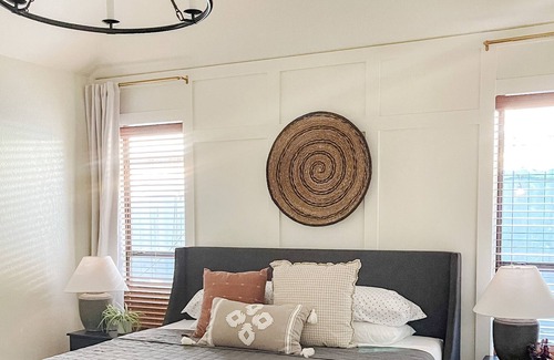 Bedroom 2: Queen bed, custom leather headboard, 55" smart TV inside the room, black out curtains