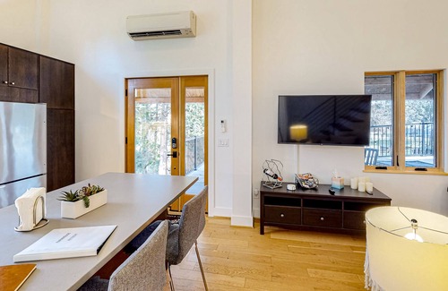 Inside, lofty ceilings and generous windows fill the cottage with light. There's a contemporary kitchen with sleek cabinetry and stainless steel appliances (including a gas stove), a breakfast bar for when you're not dining alfresco, and a living room with a cozy sectional and a smart TV. Both bedrooms - one upstairs, one downstairs - have smart TVs as well. Additional features of the house include a private washer/dryer and complimentary WiFi.