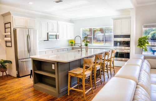 This charming modern farmhouse has 4 bedrooms and three full baths this spacious 3K sq ft home is spacious can easily accommodate up to 12 guests. The open floor plan with a living room and outdoor patio and a private splendid pool make this home perfect for big family gatherings and reunions.