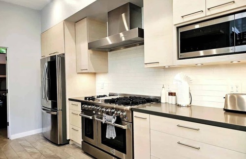 Kitchen: Fully equipped with high-end appliances, 48” gas range with double oven, and a reverse osmosis water system with hot and cold water.