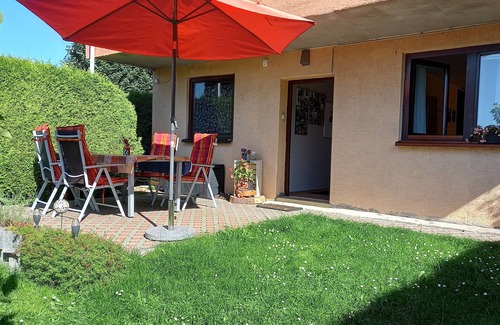 Our modern and cozy apartment (42 m2) for 2 people is only 50 m from the legendary Rennsteig. Close to the center and yet surrounded by greenery, the hiking trails start in the immediate vicinity. In winter, ski trails and lifts are just around the corner. Garden furniture, loungers and a grill are available for use in the garden. Our property is fenced and is an ideal playground for your four-legged friends. Since the sidewalks in our town are folded up earlier than elsewhere in the evening, we also have books and board games in our closets. Here you will find peace and relaxation after long walks or extended ski tours. The apartment has a separate entrance. In the living room there is a comfortable couch and armchair for relaxing and watching TV. In addition to the ceramic hob and oven, the kitchenette also has all the other electrical appliances and dishes necessary to start the day with a self-prepared breakfast. The bedroom has a double bed, here an extra bed or cot can be placed if required. The bathroom has a "blue star shower", sink and toilet. Towels, tea towels and bed linen are provided free of charge and changed regularly for longer stays. Did we inspire you? Then visit us. We look forward to you!