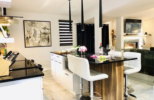 Accomodations:• A portable cot and highchair can also be provided on request.• Bluetooth Electronic Bose system on site.• All high quality linen provided as well. • 4 free parking spaces, cleared of snow and with garage• Wifi everywhere in the house• Computer on site• Netflix and satelitte TV• Video games• pool table* Basketball electric game• drum * Pac man arcade game• solarium• Christmas tree and Holidays decor• Garage to store ski equipment or more• A/C and central heat• No trouble gaz fireplace• heated floor into the bathroom• colored Led lightning • Hight quality bedding and mattress• Heated inground pool (in summer season only)• High ceiling
