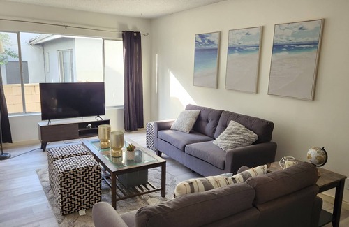 Unwind in Inglewood at this lovely townhouse-style apartment in an intimate 4 unit building. This cool and enchanting unit offers a peaceful retreat for guests. The living room, dining area, half bath, and kitchen are on the ground floor and the 2 bedrooms and full bath are upstairs. Each bedroom has a queen bed and digital locks (great for roommates) and the full bath has a tub and shower combo. The apartment features amenities like AC, heating, WiFi, coin laundry, a washing machine, and an iron. This unit is great for travelling professionals, students or vacationers. It's minutes from LAX, Sofi, South Bay, Beaches, and LA. It's just off the 405 FWY and LaCienega Blvd. Also near a major Metro rail stop.