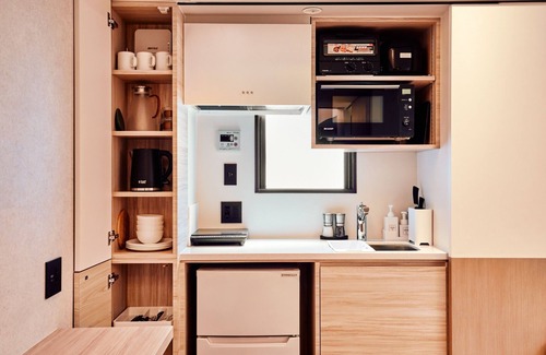 The elevator hotel has five independent suites with one suite per floor offering guests privacy Each suite is elegantly furnished with a work area suitable for small families or business travelers The hotel also offers a laundry room / This guest room is located on the 2nd floor and the only guest room on this floor The entire space is approximately 35 square meters with one bedroom and one living room The bedroom has a kingsize bed 2 single beds combined and an open Japanese style sitting area The kitchenette has a Nespresso coffee machine and all the necessary equipment and facilities for convenient living The overall space is bright and comfortable quiet and tasteful