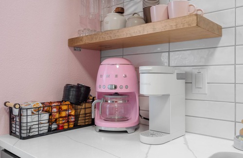 -Coffee station with a pink SMEG, creamer and sugar.