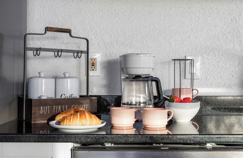 Kitchen – Fully equipped and remodeled, featuring a coffee maker, Keurig, crockpot, waffle maker, micro-chopper, pots, pans, spices, oil, and dinnerware—perfect for cooking meals at home.