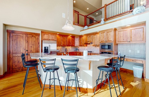 Framed by high ceilings and sunlight from the floor-to-ceiling windows, the open living room displays the heart of Saddle Ridge Ranch. With the fireplace on and your favorite movie streaming, cozy up on the living room sofa and enjoy a cup of cocoa. When hunger arises, the adjacent full kitchen boasts a full suite of stainless steel appliances, granite countertops, and an expansive breakfast bar. When you aren't dining here, there are multiple other dinner options - perfect for family-style meals.