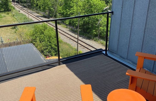 Top of the tower luxury penthouse suite. This is a very unique place to stay within a fully restored grain tower. Two bedrooms, one bath plus den with private roofdeck. No full kitchen just a kitchenette as we want you to enjoy all the amazing restaurants our area is filled with. You'll be staying just steps from the bustling shops and nightlife of Warwick. The tower suite is located on the Railroad side of the building. There is a small river, but lots of ducks and bird watching.
