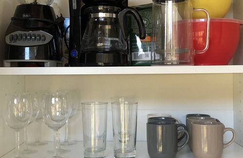 This home has a fully stocked modern galley kitchen, a queen bedroom loft (accessible by stairs) with storage cabinets, a small work desk/eating area, a spa inspired bathroom with large shower, and a full-sized couch which pulls out to become a double bed. The 10 windows allow for lots of natural sunlight and make this 215sq’ home feel large and open. This space is ideal for one or two people but can accommodate up to four people when the sofa-bed is utilized. There are multiple cupboards, closets, and shelves for you to store your personal items during your stay.