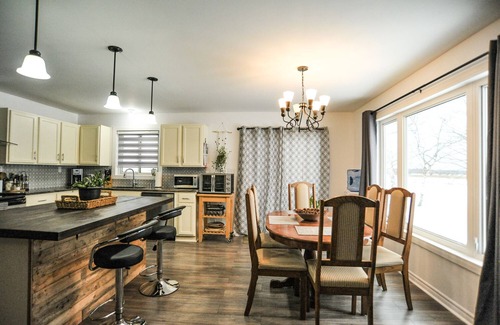 Completely renovated home with modern & rustic design elements. Warm & welcoming vibe. Open concept design connecting the kitchen, dining & living areas. 2 large windows providing plenty of natural light & great views of the countryside-perfect view of sunsets right from the dining table. Main floor features include a modern propane fireplace, high quality pool table, pull-out sofa bed, laundry area and bedroom with queen size bed, 4pc ensuite (jetted tub, spacious shower, bidet, Bluetooth speaker/fan) & large walk-in closet. Lower level features a games area with foosball table, bumper pool table & darts. Cozy up to the wood-burning fireplace. Enjoy watching a movie in the theatre space with large screen, projector, Bluetooth receiver & high quality speakers - feels just like you are at the movies. 2 extra sleeping areas, queen bed & full size pull out sofa. Enjoy the outdoors on a large property with plenty of space to roam around. Sliding doors lead to a large deck off of kitchen with patio table & chairs. Firepit with chairs & picnic table. Great location for winter & summer alike. Great spot for star-gazing & enjoying a nice camp fire with friends.