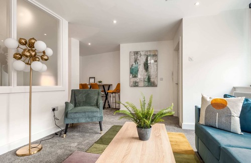 This lovely studio is a comfortable home away from home and has more than enough space for up to 2 guests. The spacious and bright living area features a large sofa, armchair and a smart Tv as well as a raised dining table with stools. There's a modern, fully equipped kitchen which has everything you need to cook your own meals at home. There is high speed broadband throughout the studio, perfect for streaming TV (e.g Netflix), and all your browsing, social media and emailing needs. The sleeping area is separated with a glass partition and features a desk/dressing table with mirror, plentiful storage space for clothes and a comfortable king size bed with crisp hotel linen. The modern and clean bathroom features a powerful shower over bath and includes complimentary toiletries and fluffy towels for your use.