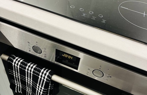 Fully equipped new kitchen is ready for cooking (cooking plate, baking oven, microwave, fridge-freezer, pans, dishes and etc)