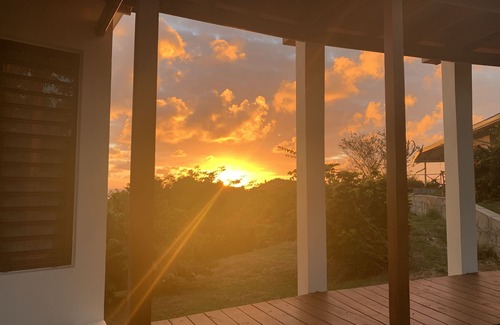 Relax in modern open space with a huge verandah in the middle of a tropical garden. Herbs and fruit at your fingertips. Open shower room looking over the vegetation. Beach is a 10 minute walk away, quiet residential area. We highly recommend you rent a car and can help with that.