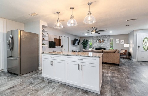 This place offers guests a stylish, yet cozy experience while enjoying quality time with your family or group of guests. Make dinner in the open kitchen with an island with the tastefully designed dining room nearby. Your group can have fun in the pool in a fully fenced-in back yard, watch a movie in the living room, or get some work done at the workspace.