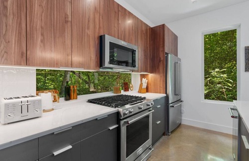 Welcome to your newly built Austin Health and Wellness Retreat. Cold Plunge + Sauna (coming soon). This Modern 2-Bed, 2.5-bath townhome feels like living in a treehouse overlooking a greenbelt and creek. Close to downtown, COTA, Airport, & the trendy Eastside scene this place has it all.