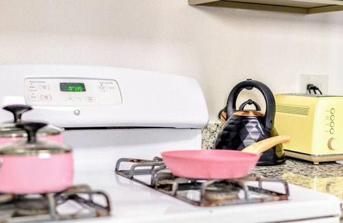 Cook with ease in a fully equipped kitchen featuring modern appliances, ample counter space, and all essentials: Refrigerator, Electric Stove & Oven, Microwave, Coffee Maker, Kettle, Toaster, Wine Glasses, Dishes, and Utensils.
