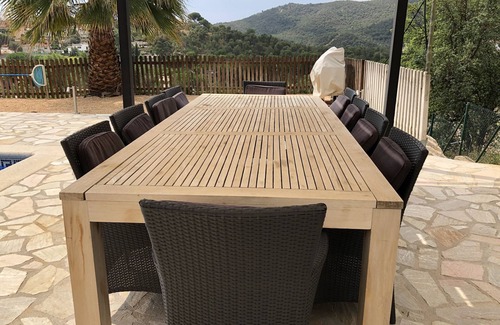 Middle terrace: between the main bedroom and the living room there is a large terrace with a dining table for 8 people with a beautiful view of the mountains and the swimming pool. The terrace is protected by a shade cloth that blocks 98% of VU light and provides the necessary coolness.