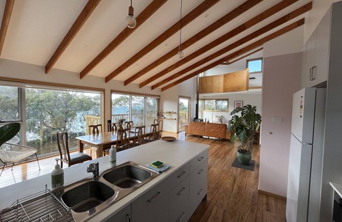 The house is a contemporary, spacious design completed in mid 2018. The house features lots of cosy, vintage furniture, a wood heater for toasty fires and a spacious balcony off the kitchen and living area. There are big picture windows upstairs and in each of the queen bedrooms, which look right out to the water and surrounding hills.