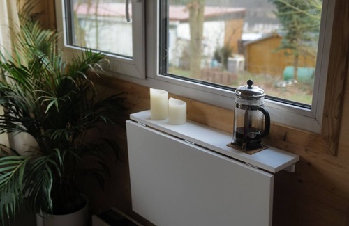 Guest accommodations at Modernes und Gemütliches Tiny House Direkt am See in der Natur offer coffee/tea makers. Rooms open to patios. Kitchens or kitchenettes offer refrigerators, stovetops, microwaves, and cookware/dishes/utensils. Bathrooms include showers.