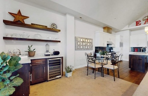 As you enter the townhome, you’ll enter the very open and bright Great Room, featuring rich wood floors, high ceilings, and extra wide glass sliding doors that lead to a deck that offers amazing views of the treetops and the various peaks of the Cascade Mountain Range. Here, you will enjoy a new Weber natural gas grill and seating to enjoy the views. Back inside, the Great Room features a 77 inch LG 4K smart TV as well as a large, modern fireplace for those cool Winter nights. Enjoy the comfort of the modernist style furnishings.