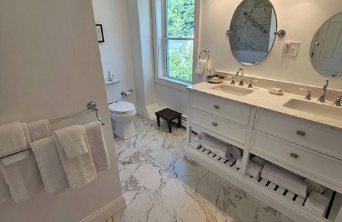 The Monhegan Suite is named after one of the nearby islands in Penobscot Bay where Rockport Harbor is located. This second Level Queen bedroom is accessed by the front entrance staircase. The room opens to skylights, luxury bedding, elegant decorations, romantic electric fireplace, flat screen smart TV, spacious walk in closet, and air conditioner unit. The connected en suite bathroom overlooks the courtyard gardens and has a double vanity and full bathtub/shower. Access to the lower level of the house is restricted (unless the whole house is reserved), but Monhegan Suite guests are welcome to use the firepit in the backyard. Access to adjacent lodge outdoor heated pool (open seasonally), and guest BBQ, firepit and gardens is also included plus free morning coffee in the lodge office. Entry is through Inn front door and parking is on grassy knoll alongside driveway. No smoking in or on this property. No dogs allowed in Monhegan Suite. Check in at Starlight Lodge Office. 2 night minimum/$50 cleaning fee.