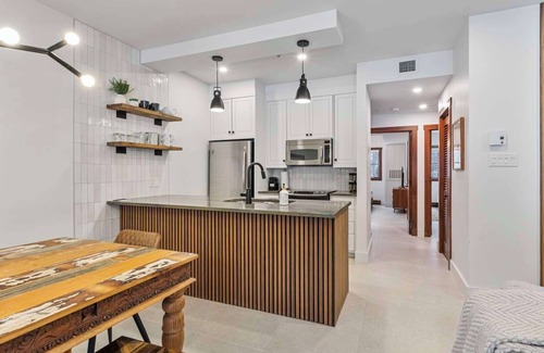 After an exhilarating day on the slopes, relax in the cozy warmth of the stone fireplace. For total relaxation, enjoy the four-season hot tub with mountain views, or a refreshing swim in the expansive outdoor pool (summer only), pure bliss on your doorstep. The beautifully designed condo boasts an open-concept layout with large windows that flood the space with natural light, offering breathtaking mountain views at every turn. Enjoy memorable meals with your loved ones around the stunning rustic dining table. Relax on the soft sofas in the spacious living room. The master bedroom has a luxurious King bed. The guest bedroom has two Queen beds, while a comfortable Queen sofa bed in front of the gas fireplace will delight you. Two bathrooms with up-to-date glass showers.