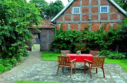 The cottage style country offers you a spacious, comfortably furnished apartment with four bedrooms, a fully equipped kitchen, a large living and dining room, two bathrooms and a terrace and garden. A large hall with adjoining stables may be a popular setting. The large apartment can accommodate 7 people. Living room and bedroom are equipped with TV and Wi-Fi. The apartment has a separate entrance and is rented year-round.