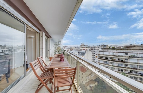It is located at Montparnasse, on rue du Depart, just in front of the 210m Montparnasse Tower. At the 9th floor of a modern building with two elevators. The apartment offers a master bedroom with a double bed and an antique wardrobe. There is a large living room with one sofa convertible in a comfortable bed for two people. The living room provides also an antique console with a mirror, a large dining table with four chairs, and minor furnishings.