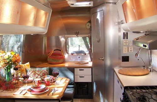 The lovingly refurbished 2004 Airstream s original interior was designed by Christopher Deam, and was one of the first "International CCD" designs. It s conpact, yet bright and airy with lots of counter space for cooking, dining, playing board games, and writing your novel. There s even a seperate desk for additional counter space.