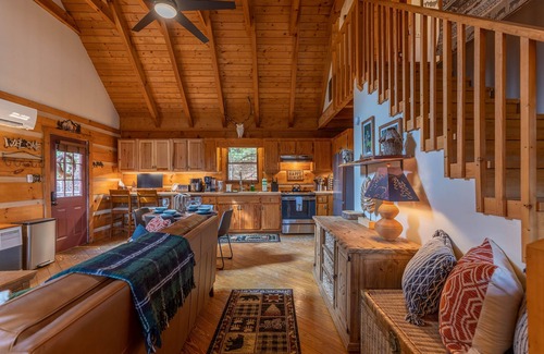 The main living area includes a stone gas fireplace, big screen smart TV and kitchen/dining area fully equipped with everything you may need. Relax and unwind in a log king bed on the main level or a queen log bed in the upstairs loft. Both levels have a full bathroom. Newly installed central heat and air conditioning system will keep you toasty warm or cool and comfortable in any weather.