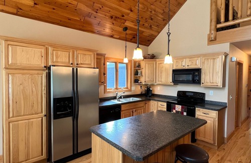 Moose Lodge can sleep 12+ in its four bedrooms, plus 1 room with a plush full futon and ample common space. The main floor has the master bedroom, full bathroom, and an open area with a fireplace overlooking the lake. A loft with two bedrooms and a full bathroom has a landing area perfect for watching the memories being made below or enjoying the natural beauty through the two-story wall of windows. Downstairs you can walk out onto the patio or stay inside and have some fun playing pool, sitting at the bar, playing games, or watching movies. The downstairs also has a full bathroom.