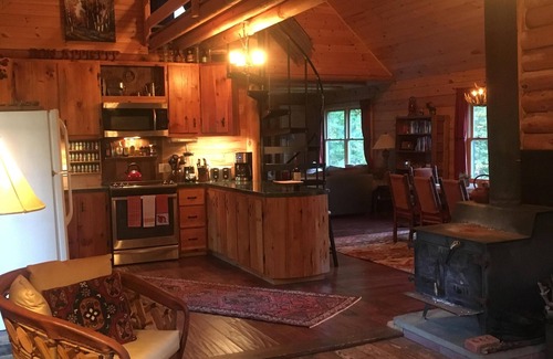 Moose Pond Cabin is the perfect romantic get-away for couples, a great place to enjoy close friends, or wonderful family bonding place. We provide attention to cleanliness, privacy, beautiful cabin decor, attention to detail for your comfort, and always personal and helpful service. Nestled away in the woods, our rustic log cabin with 3 bedrooms & 2 bath, that sleeps up to 8. The first floor offers one queen bedroom, light and bright cathedral ceiling fully equipped kitchen, dining room, living room, and family room that allows for great conversation and activity flow. The second floor includes two bedrooms, connected by a bridge. One with a king bed and the other a custom-built bunk room, great for the kids. The cabin sits on 8-wooded acreage, offers a small pond (non swimmable) frequently visited by Moose, trails for hiking, skiing, snowmobiles, snowshoeing, sledding and watching the abundant wildlife. In Summer, Spring or Fall our spacious yard is perfect for outdoor games. Swing in the hammock, cook out on the grill, sit around the fire pit in the evening and watch the stars go by.. and most of all, enjoy Peace and Tranquility! We love our Moose Pond Cabin, you can see more of us on our very own page of moosepondcabin . or like our face book page for more updates, Moose Pond Cabin! Great home where family and friends can get together for a rustic Vermont experience. PLEASE NOTE: Max. occupancy: 6 adults, or 8 people including children. * Please contact us for holidays rates. ** LINENS, PLOWING, TRASH & FIREWOOD INCLUDED. *** House is isolated and few cell phone carriers have a signal. (AT&T works okay) ***** 4 wheel drive necessary to access the property during inclement (i.e snow or ice) winter weather.