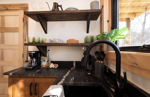 The Morel is equipped with everything you need for simple meals and snacks, making it ideal for an easygoing getaway. Amenities include a microwave, mini fridge and freezer, toaster oven, coffee pot, toaster, and blender. A charcoal grill is available for outdoor cooking, while the two balconies provide stunning spots to enjoy your meals surrounded by trees and sky.