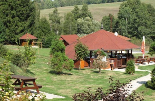 Svojanov u Mor.Třebové 12 km from Moravské Třebové: Child friendly, very beautiful resort "Motýlek", 420 m a.s.l.. 11 houses in the resort. Outside the resort, in a quiet, sunny position, 50 m from the edge of the forest, 13 km from the lake, in the countryside. For shared use: property 2 ha, meadow, swimming pool (10 x 5 m, depth 130 cm, seasonal availability: 30.May. - 26.Sep.). Outdoor shower, table tennis, children's playground. Private: property with lawn 100 m2. Patio, terrace (10 m2), garden furniture, barbecue. In the complex: reception, bistro, WiFi. Motor access to the house. Parking at the house. Shop 12 km, grocery 3 km, supermarket 12 km, restaurant 3 km, pub garden 200 m, bus stop "Borušov-Svojanov" 200 m, railway station "Moravská Třebová" 12 km, grass beach 13 km, outdoor swimming pool 50 m, indoor swimming pool 10 km. Golf course (9 hole) 45 km, tennis 12 km, walking paths from the house 50 m, cycle lane, cross country ski track 50 m. Nearby attractions: Moravská Třebová 10 km, Úsov 25 km, Bouzov 30 km, Javoříčko 35 km, Olomouc 50 km. Well-known lakes can easily be reached: Na Jahodné 13 km. Please note: fishing [permit required]. The photograph shows a typical example. The holiday complex is situated in fantastic nature, 30 km west of the nature reserve Litovelske Pomoravi. Ideal for mushroom-pickers. Extra: Hot-air balloon flights, sightseeing flights, fishing (all have to be ordered beforehand), massages, firewood. For rent (extra): badminton, table tennis, soft tennis.